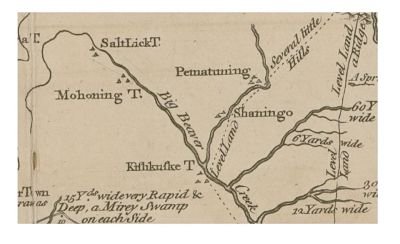 Pictured is a portion of an ancient map of Indian towns drawn by Thomas Hutchins in 1764/1766. Indian encampments are indicated by small triangles. You can see the location of Kushkushkee Town encampments in present day Lawrence County.