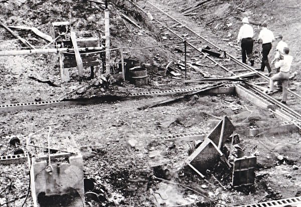 This day (July 6, 1964), the dinky car had just picked up a full car of nitroglycerin paste at the Gel House and had gone down the hill to prepare it for shipment. Had the blast occurred a few minutes earlier, the blast would have been unimaginable. Dad explained how the walls blew out and the roof collapsed on top of him. He managed to crawl out from under the roof and fall down over the hill before the larger blast that immediately followed that killed his coworkers.