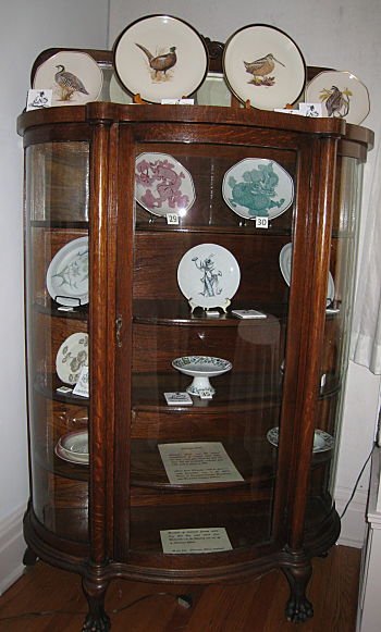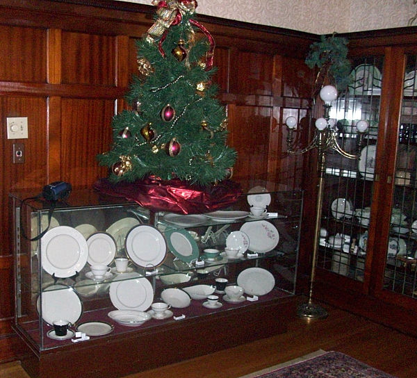 The dining room table is made of walnut. The table was originally in the home of George W. Johnson, founder of the Johnson Limestone Company. The chairs and pedestal are decorated with hand-carved griffins. The table seats fourteen comfortably. The china was made at the Shenango China Company.