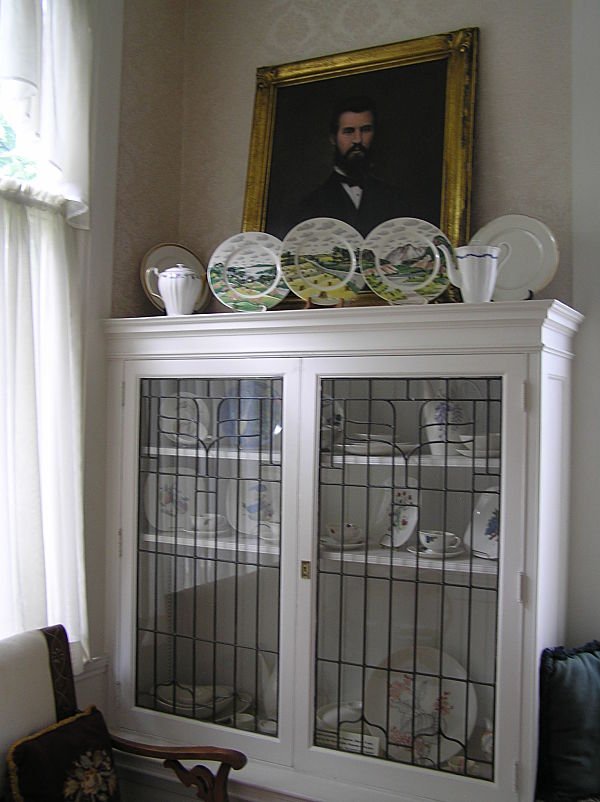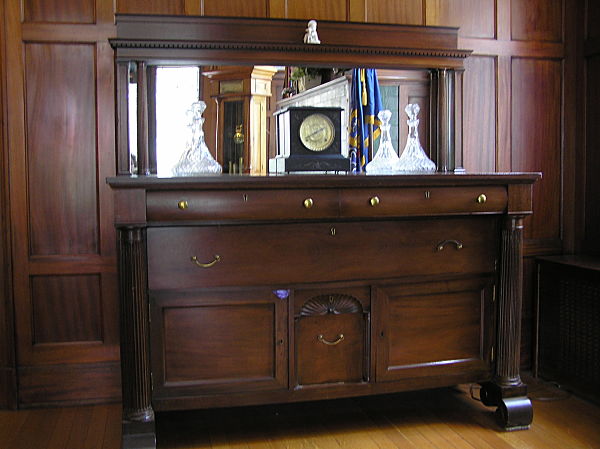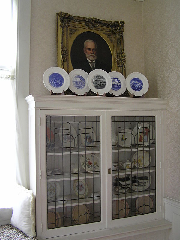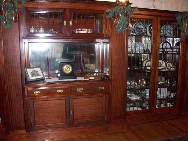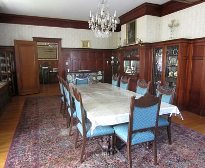 The dining room is paneled in mahogany and the glass in the built-in china cupboards and buffet is beveled, leaded-glass made by the Fry Glass Company of Rochester, Pennsylvania. The original owner of the mansion, George Greer, was a member of the board of the Fry Glass Company.
