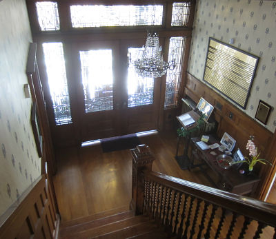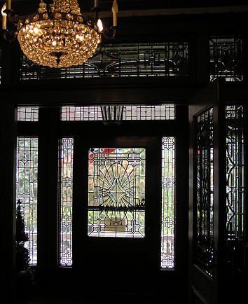 The ornate front doorway featuring beveled, leaded-glass leads into a center hall and a stairway of carved oak.