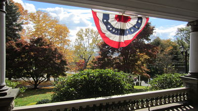 The Colonial Revival style home has a veranda style front porch which seats 60. It is decorated with red, white, and, blue bunting to celebrate New Castle’s bicentennial.