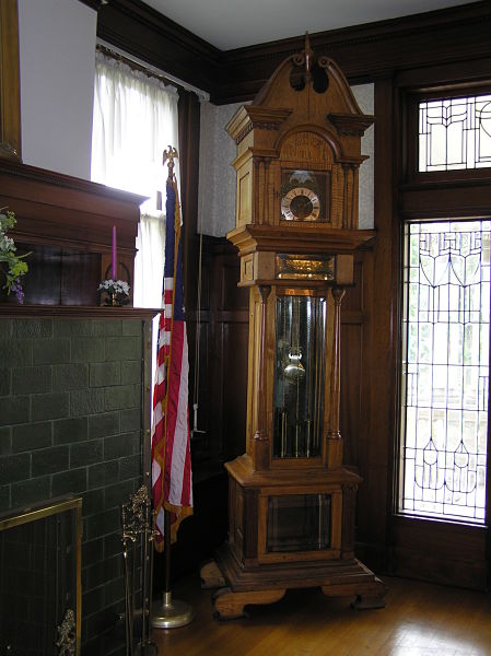 The main staircase is made of golden oak, accentuated with hand-turned spindles. The landing contains a Grandfather’s clock made of all Lawrence County hardwood. The portrait is Joseph A. Clavelli, who donated the museum to the Society.