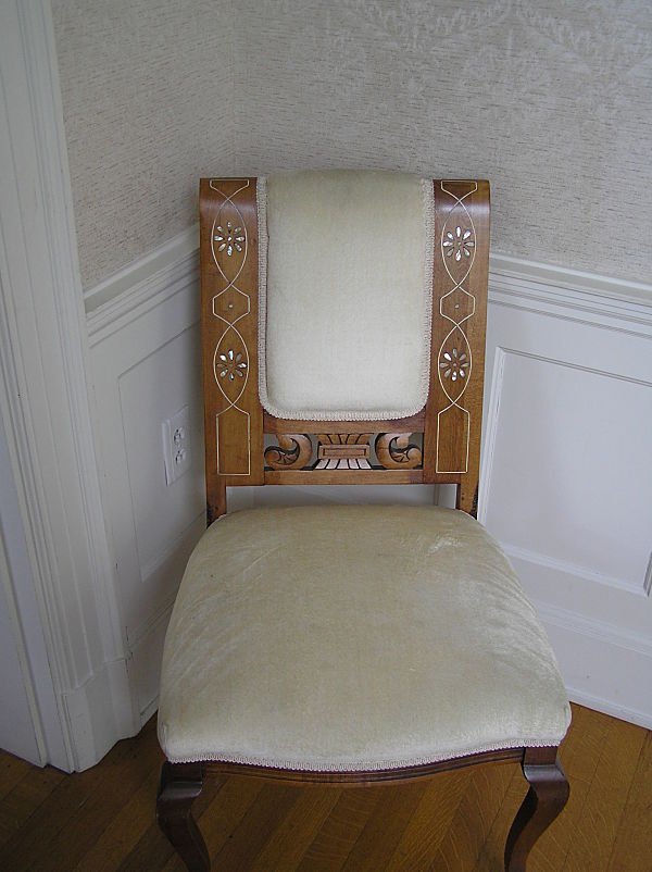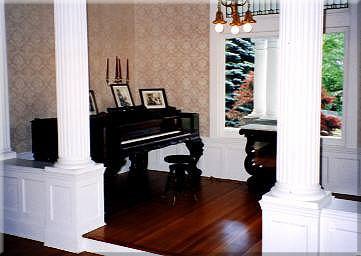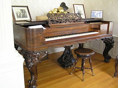 Massive Greek columns give the formal drawing room a classical feeling. The drawing room contains a flat-top rosewood baby grand piano that dates to the 1840’s.