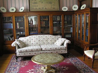 The library is paneled in mahogany. The doors in the built-in bookcases are comprised of Fry beveled, leaded-glass.