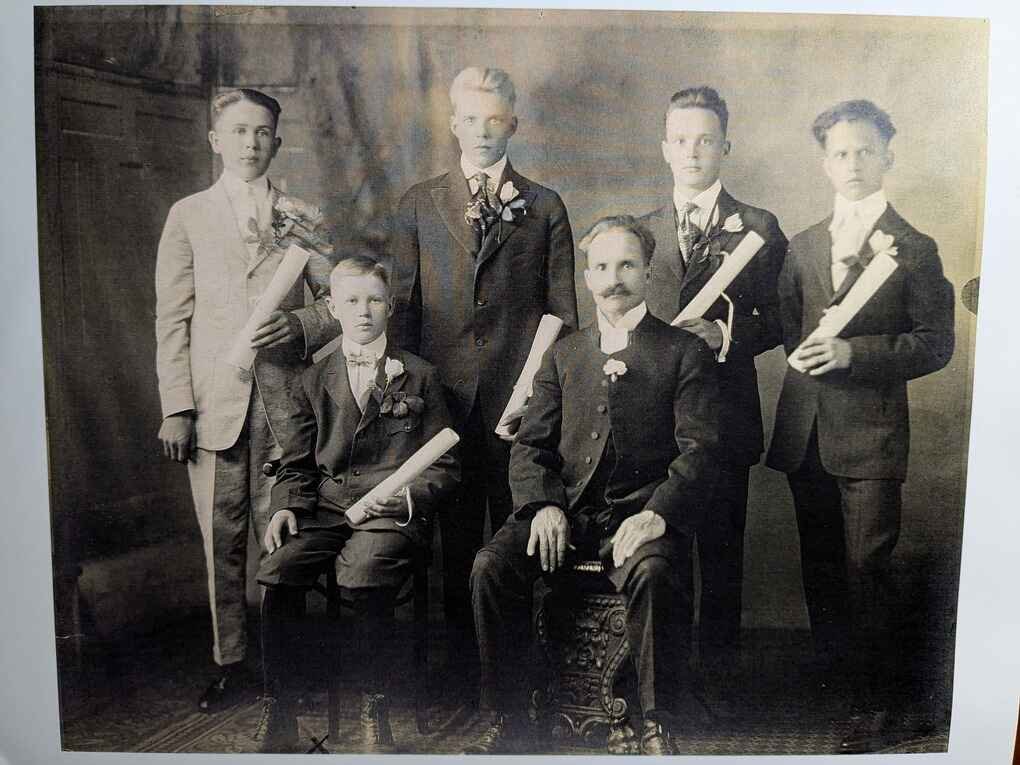 Photo taken July 1918 in New Castle, PA. of 15 year old Finnish boy named William Matias Pirttinen (seated in the front row left). He is with his church Confirmation School group and the certificate he is holding is in Finnish. The pastor, seated next to him, has a possible surname of Maattala, Muattala, or something similar.