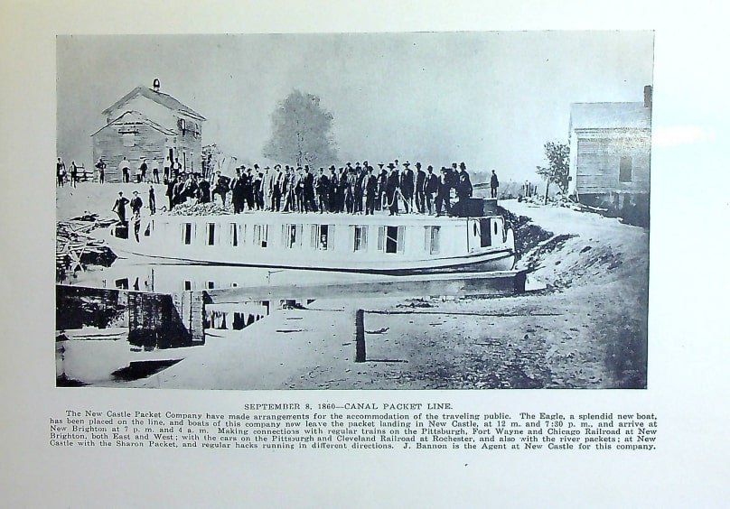 The Eagle, a new boat on the New Castle Packet line, prepares to leave one of its scheduled stops (September 8, 1860). Packets, primarily used for passenger service, left the New Castle packet landing at 12 noon and 7:30 p.m., arriving at New Brighton at 7 p.m. and 4 p.m., timed to make connections with trains going east and west.