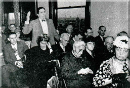 After The U.S. Steel announced in 1946 that the National Tube Plant in Ellwood City would close, labor leader, and later State Senator, Samuel G. Neff addressed the U.S. Steel shareholders at their annual meeting to urge that the decision be reconsidered. Seated by Neff is United Steelworkers leader Martin Kovach. Note the expressions of boredom and impatience on the faces of the stockholders. The plant did not close until 1974.