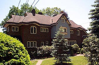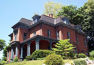 A two and one-half story square plan, patterned masonry Queen Anne residence has many fine architectural features – a three story tower with conical roof in the east bay, a two story bay window with conical roof at the west side and brick cladding with decorative rough cut stonecourses, quoins and window surrounds. It also has distinctive red tile rooting and tall interior chimneys with patterned masonry.